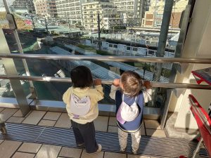 電車が見えるゾーンでは「でんでん!」と電車を呼んだり「バイバイ」と手を振ったり。