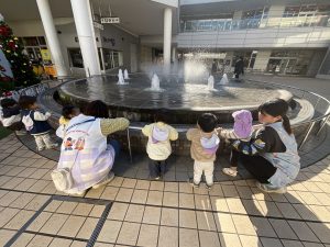 駅前の噴水広場にて。風で水しぶきが飛んできて「わぁ〜!」と手足をバタバタ!嬉しそうです。