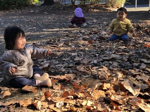 みんなの顔よりも大きな葉っぱも落ちていて枯れ葉のシャワーをすると大喜び!