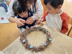 可愛くてカラフルな飾りが出来上がり、一つひとつ丁寧にリースへと取り付けられました。
