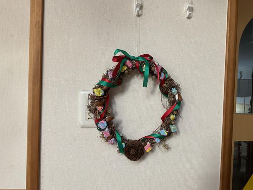 可愛くてカラフルな飾りが出来上がり、一つひとつ丁寧にリースへと取り付けられました。