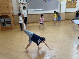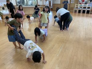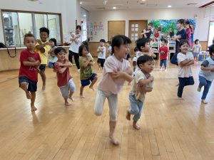 今日は木崎先生を招いて、みんなでリズム遊びをしました。昨年度も来ていただき、その時のことを覚えている子もおり、木崎先生の周りには自然と子どもたちが集まっていました。