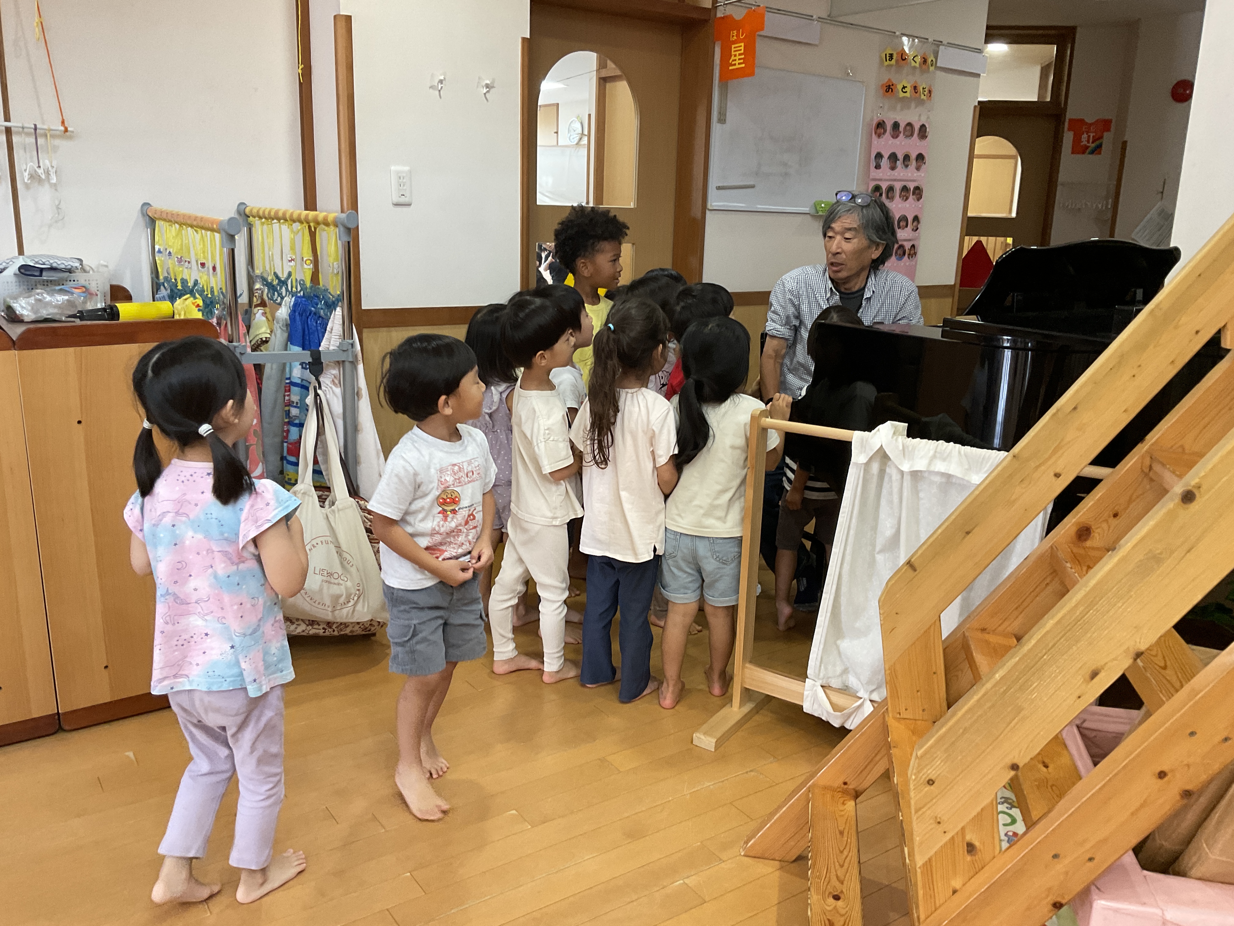 いつもの保育者が弾くピアノとはちょっと違う雰囲気を感じながら、楽しんでいる様子。