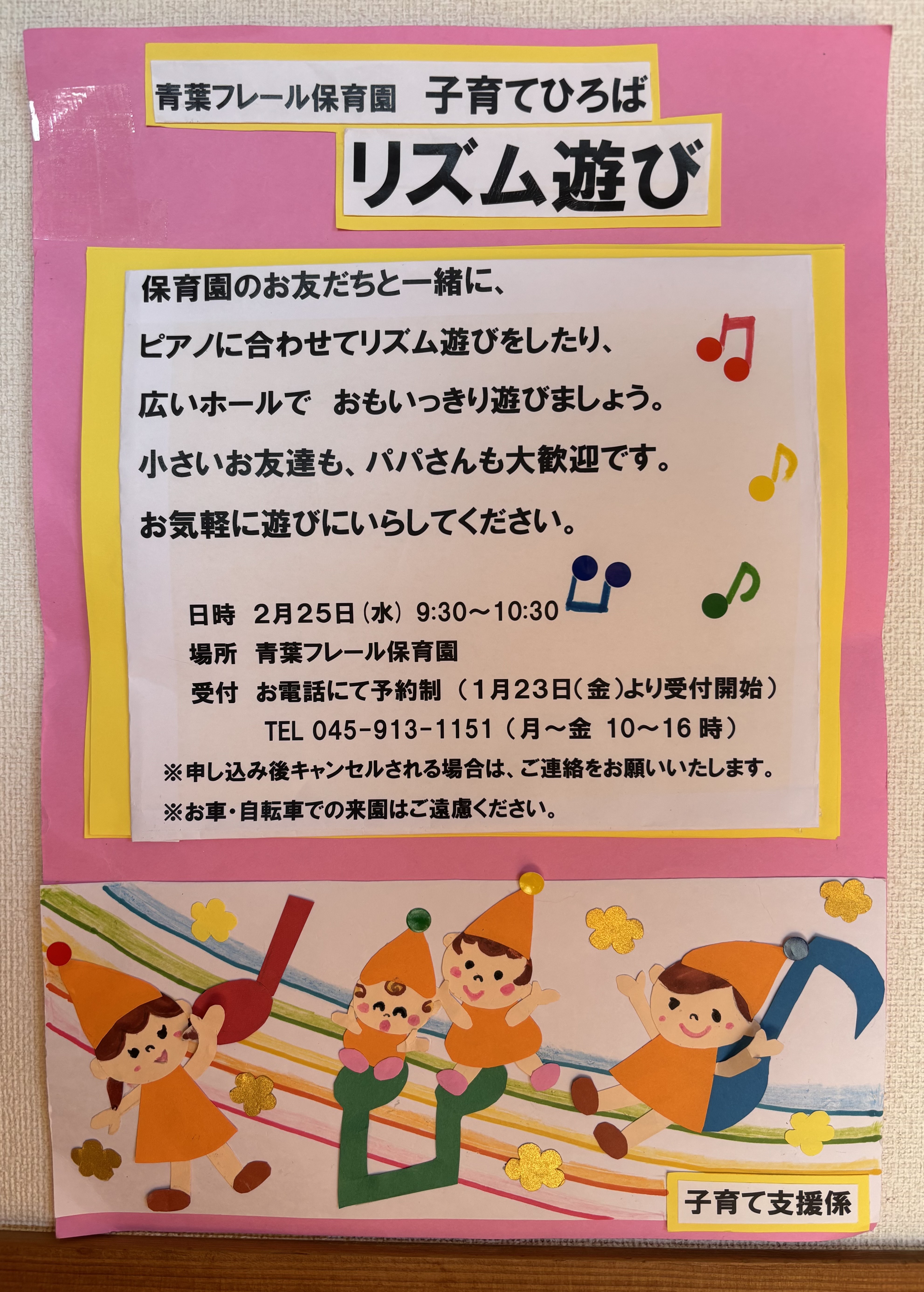 イベント, お知らせ 子育てひろば(交流保育)「リズム遊び」 2026年1月23日 | by aoba_cms 2月25日(水)9:30〜10:30 園の子どもたちと一緒にリズム遊びを楽しんだりホールでおもいきり遊びましょう。 事前予約制となっております。本日10時よりお電話にて受付開始です。 Instagramでも情報配信中 ↓クリックするとInstagramのページに移動します 青葉フレール保育園 Instagram