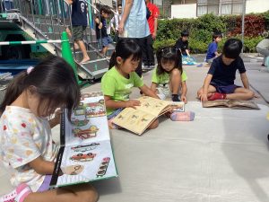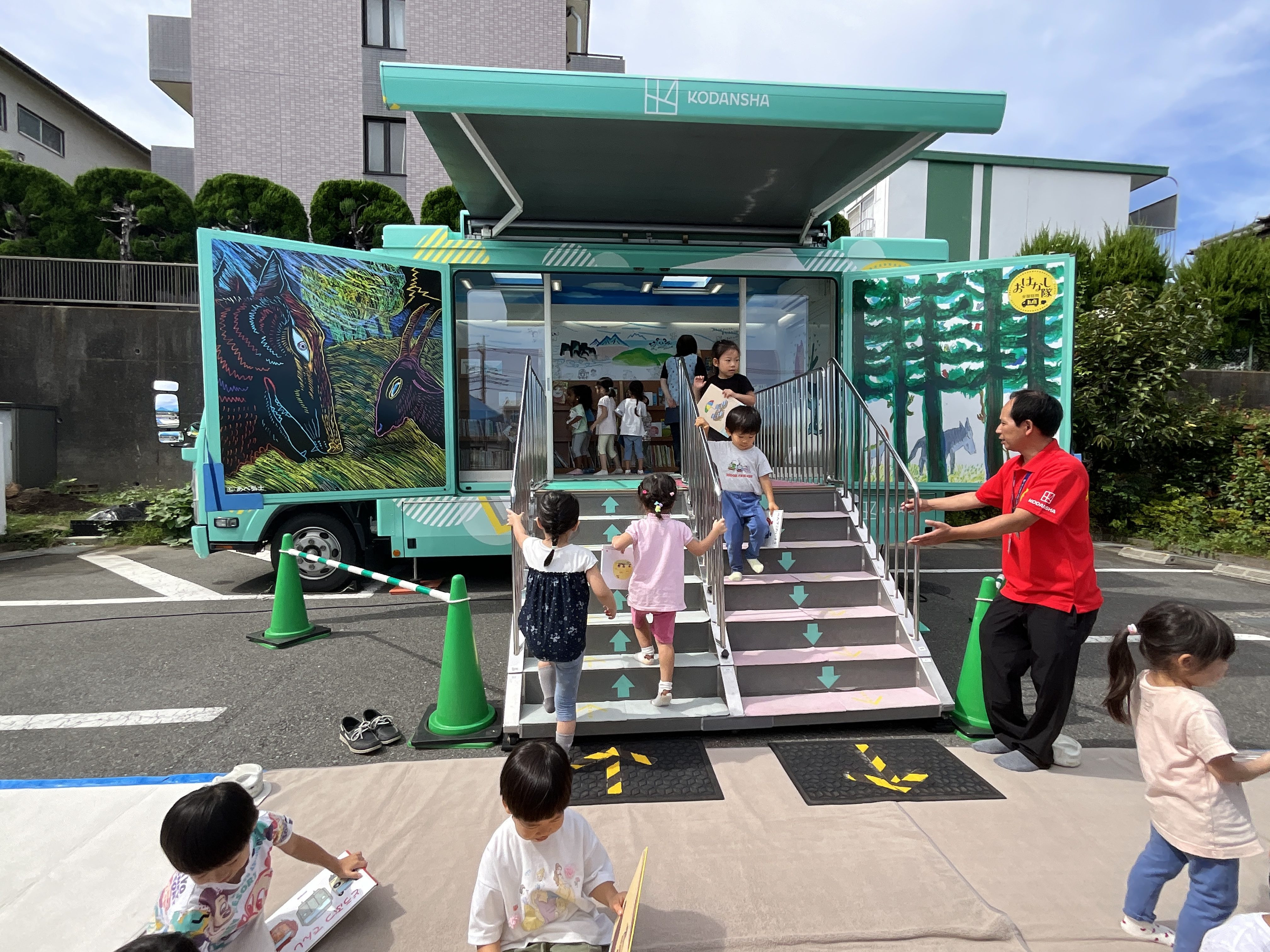 キャラバンカーの中には500冊以上の絵本があり目をキラキラ輝かせる子ども達。