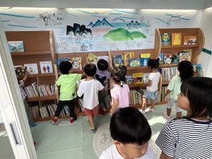 「なにをみようかな~」「この絵本面白い!」と友達や先生と会話をしながら、たくさんの絵本に親しんでいました。