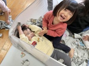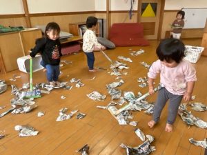 最初は新聞紙で存分に遊ぶところから!ちぎってまいあげて、新聞紙シャワー!今までボールプールで遊んだり、落ち葉を舞い上げた遊びの経験を活かして大盛り上がりです。