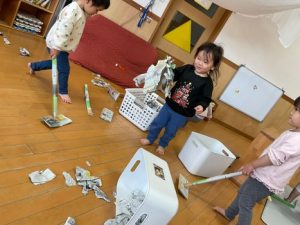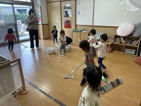 まだ本当の掃除は難しいお年頃ですが、新聞紙の手作りモップとはさみを使い、ちぎった新聞紙をゴミに見立てて、遊びから風習の体験を楽しんでいます。