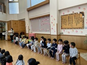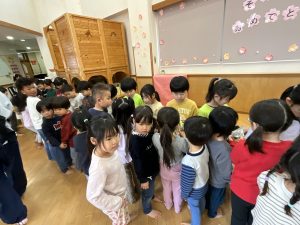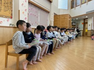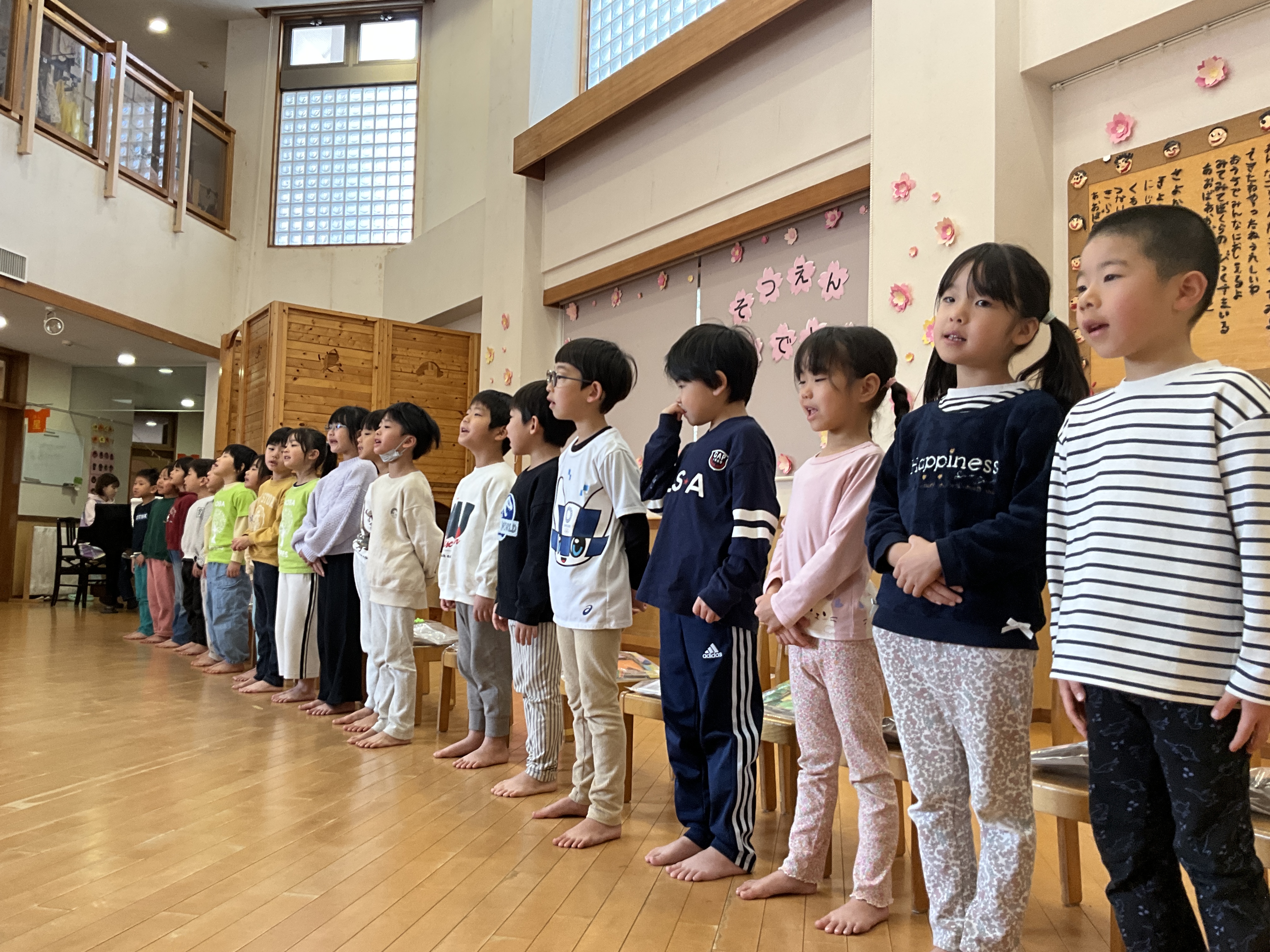卒園式を2日後に控えた今日、在園児から卒園児に「おめでとう」の気持ちを伝えるため、そら組おめでとうの会を開きました。