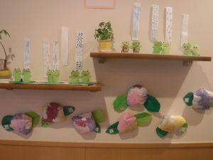 そら組のJ君から、「(ホールに飾っている)カエルさんの横にあじさいを作りたい!」と声があり