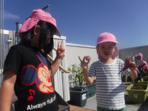 その後、お給食さんと園庭で遊んでいる乳児クラスのお友達に、お芋が取れた事を報告しました