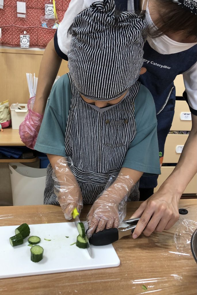 「きゅうり大好きだから大きく切りたい!」「少し苦手だから細いのにしようかな~」「小さく切るとたくさん食べられるよ!」とそれぞれの思いに合わせてきゅうりを選び、切っていました。