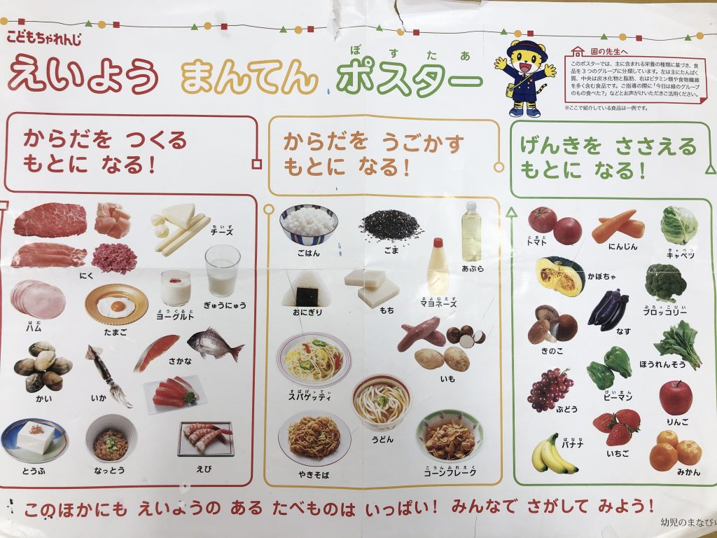 毎日保育室に掲示してあるポスターを眺め、「これは体を作ってくれるんだね」「元気を支えてくれるんだね」と食品に対する学びを深めていたそら組。