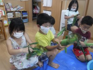 そら組はとうもろこしの皮むきの手伝いをしたり、