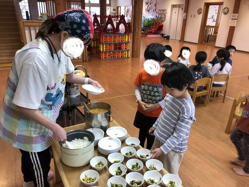慣れない環境に緊張しているお友達もいましたが、大好きなカレーライスをとっても美味しくいただきました🍛!