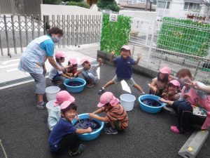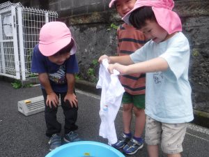 たらいのぬるま湯をさらにかき混ぜ、一人ずつ子ども達がTシャツをたらいに入れます