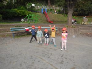 後半は、広場の方でかけっこをしたり、マイバックを持って落ち葉拾いをしたりしました。