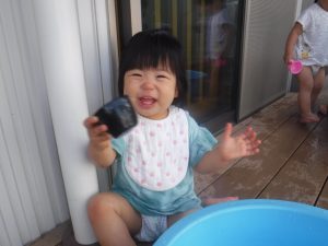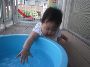 11日、デッキでタライにお湯をはり、感触遊びを楽しみました。