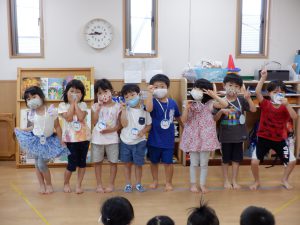 続いて、各クラスの代表のお友達に「水遊びで頑張ったこと・楽しかったこと」を発表してもらいました。