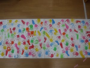 大きな模造紙に、手のひらをペタペタ!
