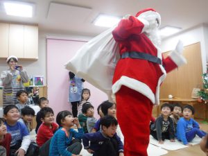 どうしたらフレール保育園にもサンタさんが来てくれるかな?と聞くと「いい子にしてたら!」「静かに寝ていたら!」と声が上がり、みんなで目を閉じて静かに待っていると・・・