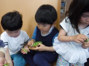 5月9日(木):グリンピースのさやむき 2019年5月16日 | by authormitsuzawa くも組(3歳児)、かぜ組(4歳児)、そら組(5歳児)のお友達が、給食のご飯に入れるグリンピースのさやむきをしました。さやつきのグリンピースを初めて見る子が多く、観察したり匂いを嗅いだりして楽しみながらむいていました。