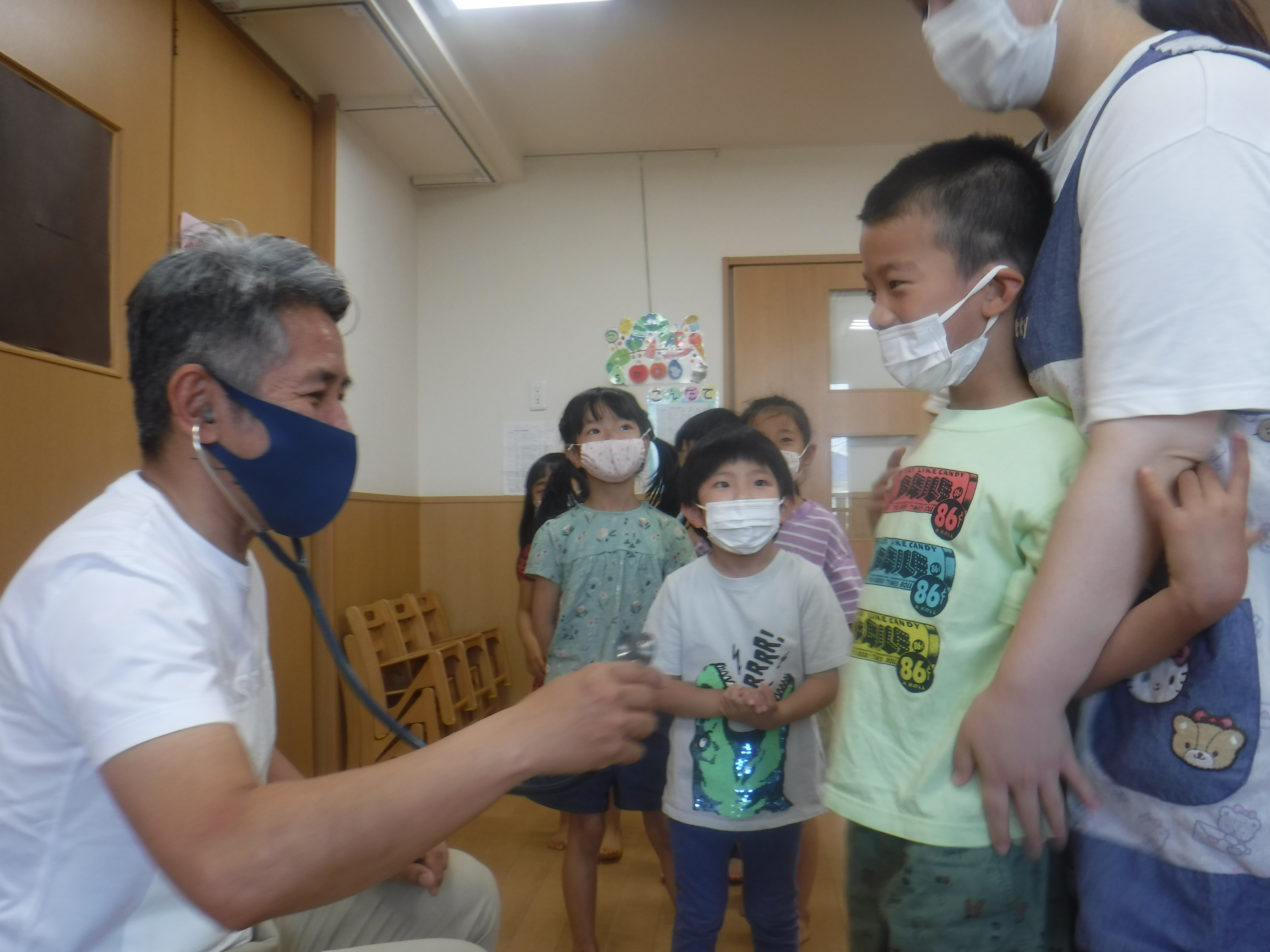保育のようす 6月1日(水):内科検診 2022年6月2日 | by authormitsuzawa 園医の西川先生に来ていただき、内科検診を行いました。 0~2歳の乳児クラスは緊張した表情も見られましたが、 3~5歳の幼児クラスは診て頂いた後で それぞれきちんとお礼の言葉を伝えられました。 西川先生、ありがとうございました。