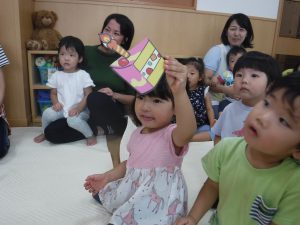 パネルシアターに興味津々で幼児クラスは雲の形から連想して、「ラーメン」「アイス」「おにぎり」等