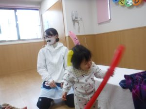 風船をペタ!!沢山風船がくっつくと、驚いて離す姿が見られ、可愛い姿にみんなが笑顔になりました