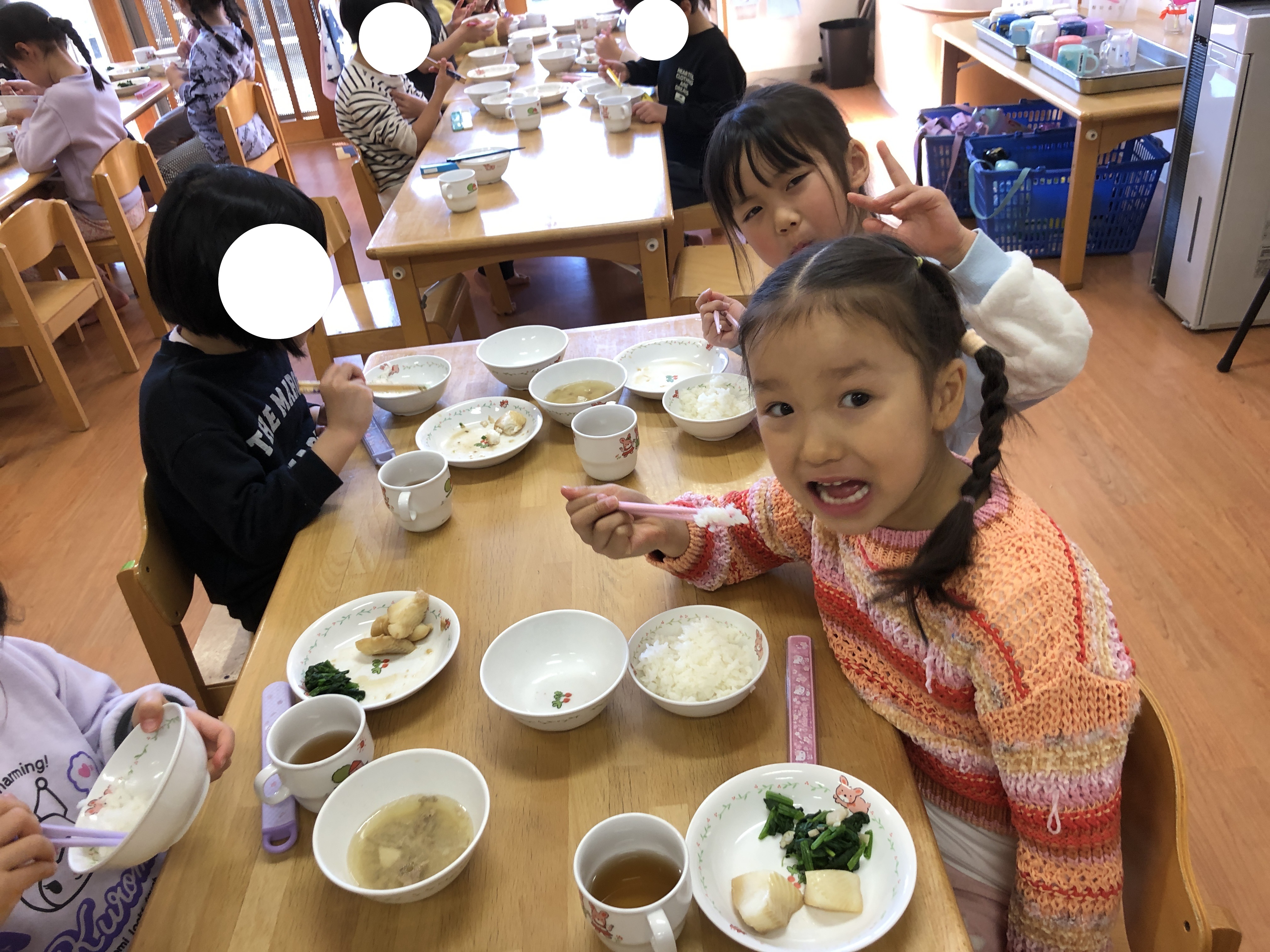 園庭で遊んだ後は、給食を一緒に食べました!普段とは違うお友達と一緒に食べるので、ちょっぴりドキドキしながらも特別感を味わうことができました。