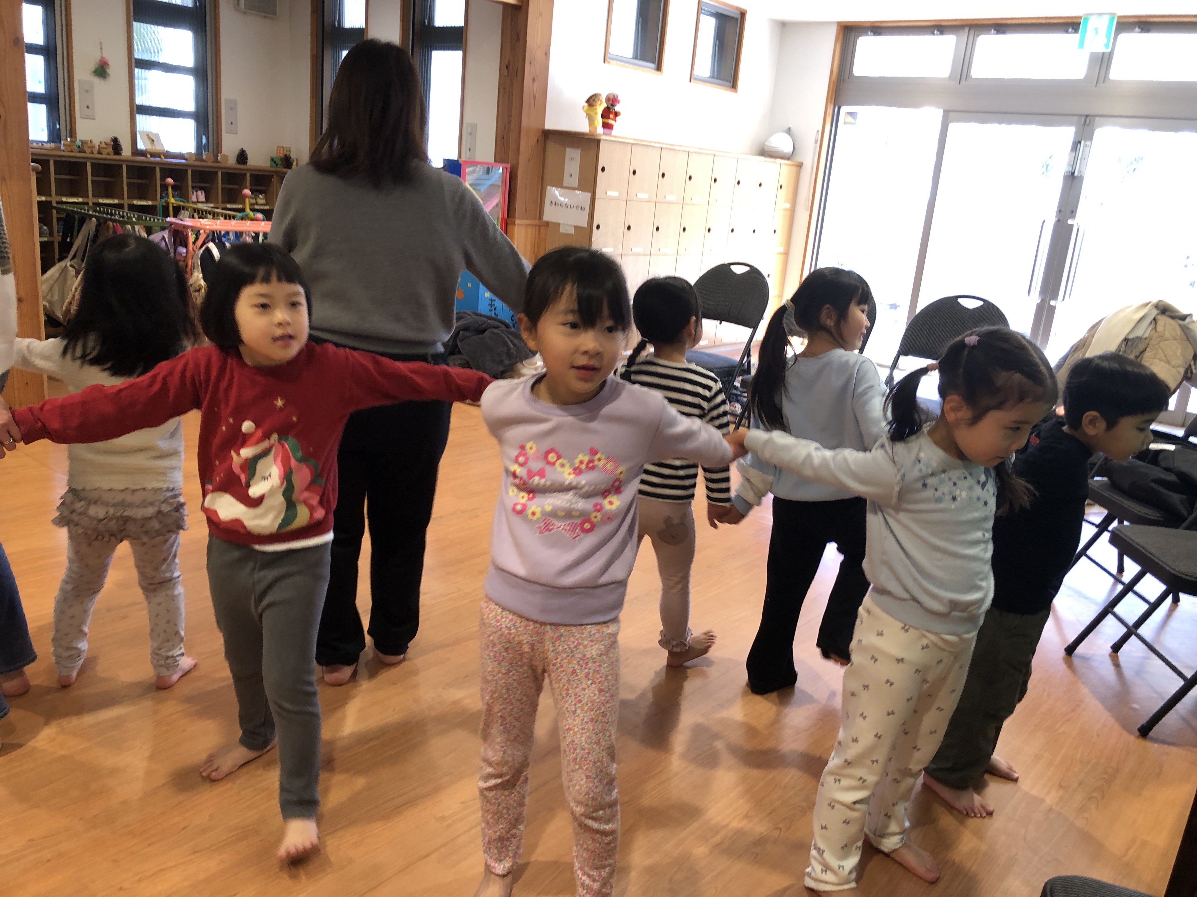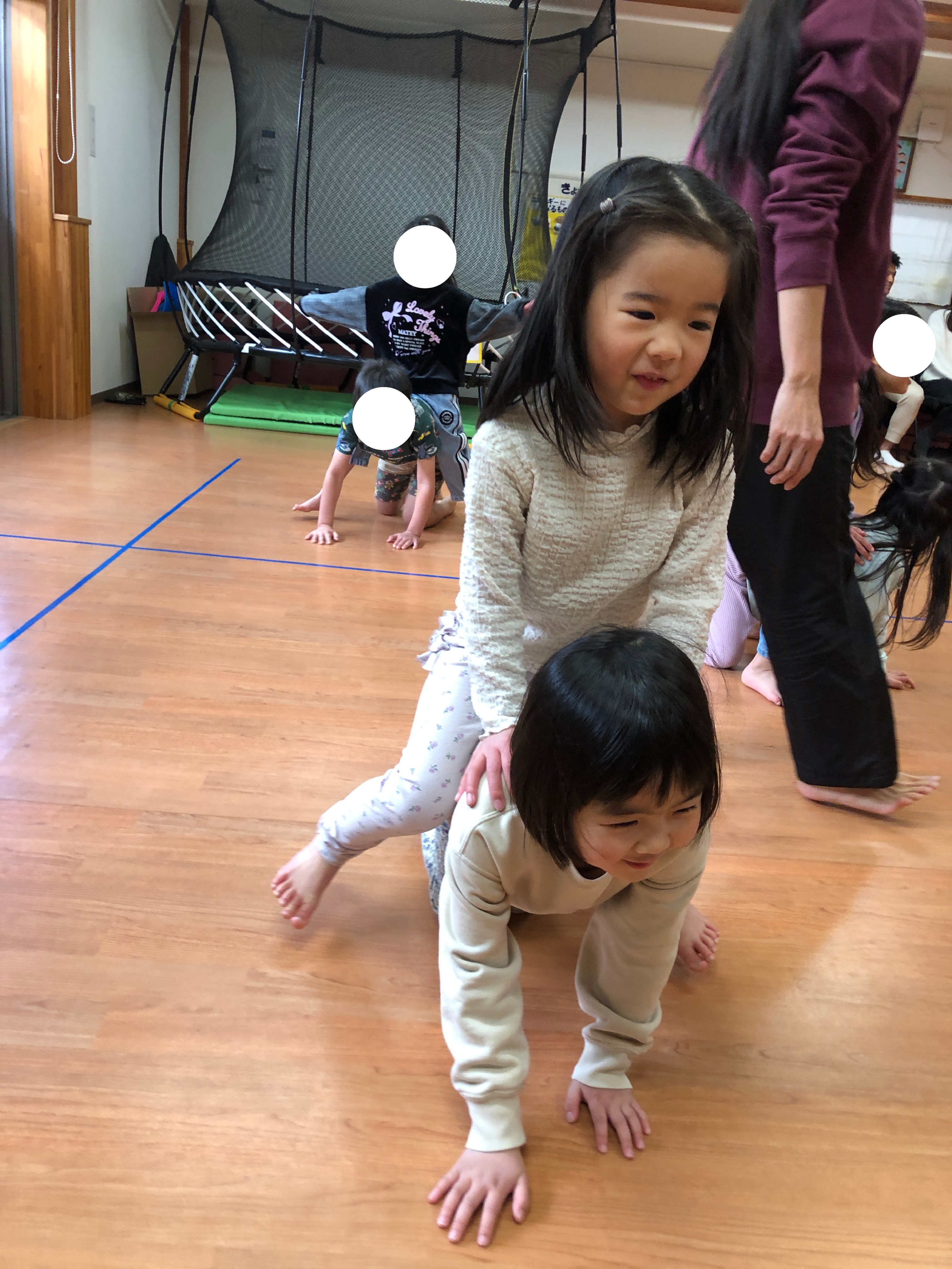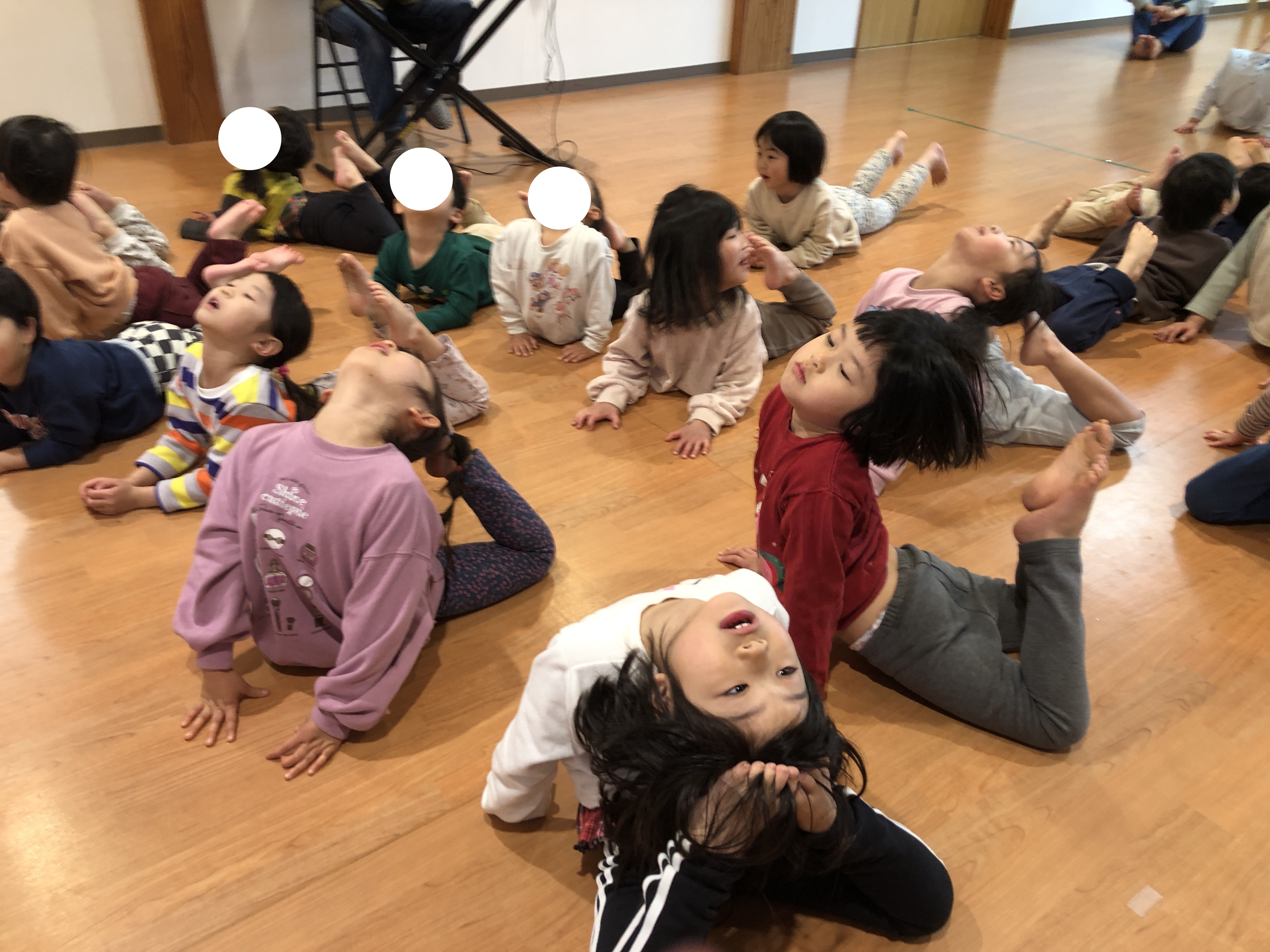 トンボやツバメなどの走る動きやカエルやアヒルのように足腰を使った動き、ブリッジや白鳥など柔軟性が必要なポーズにも挑戦します。お友達とペアやグループになって、なべなべそこぬけや糸車では手を繋いで楽しむ動きも。沢山体を動かして楽しむことができました。
