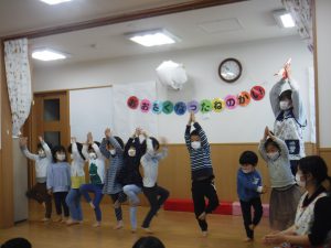 「おおきくなるっていうことは」に合わせて、かぜ組が早く走れるようになったことやブリッジや縄跳び等、出来るようになった沢山の事を発表しました。
