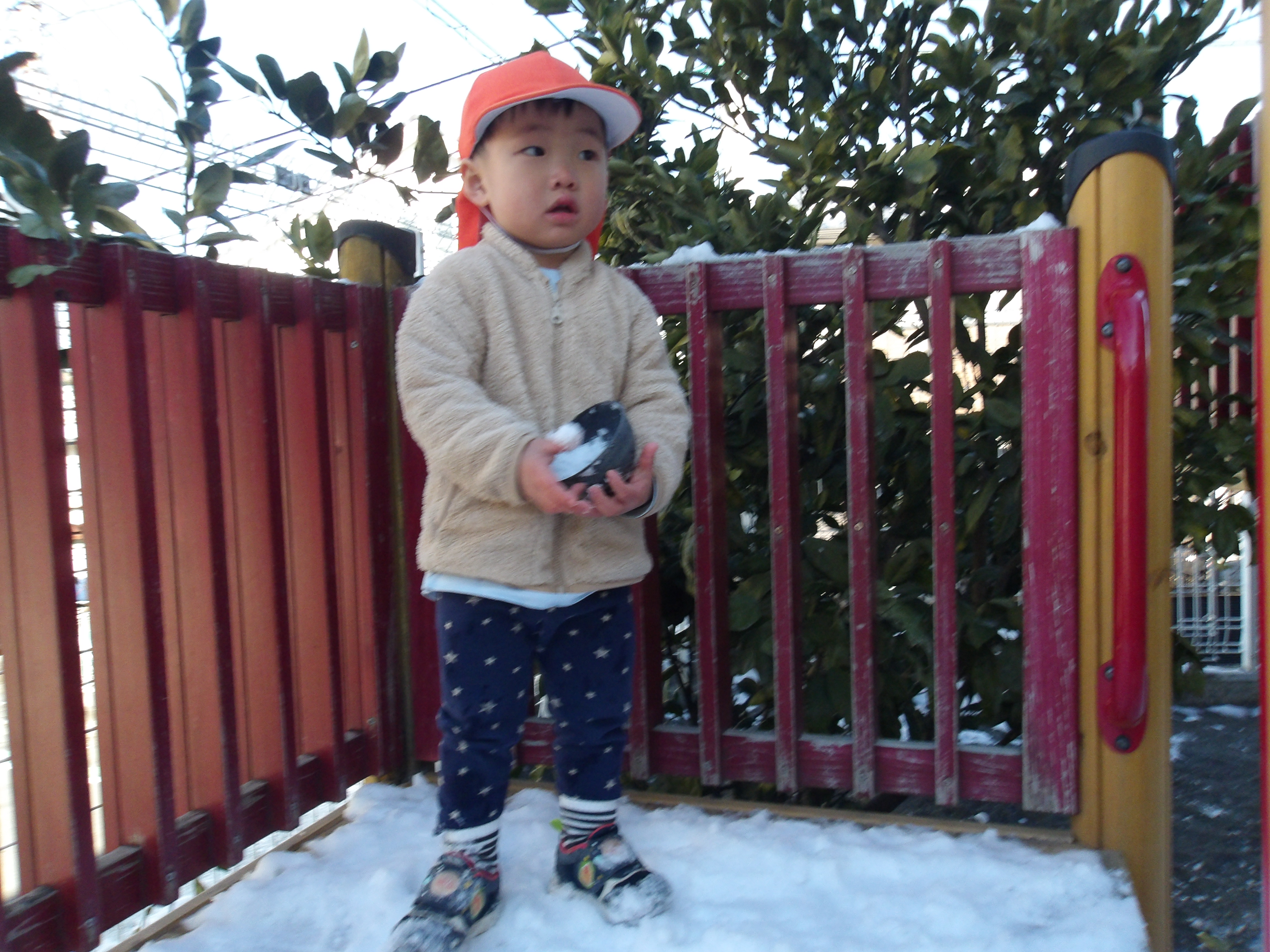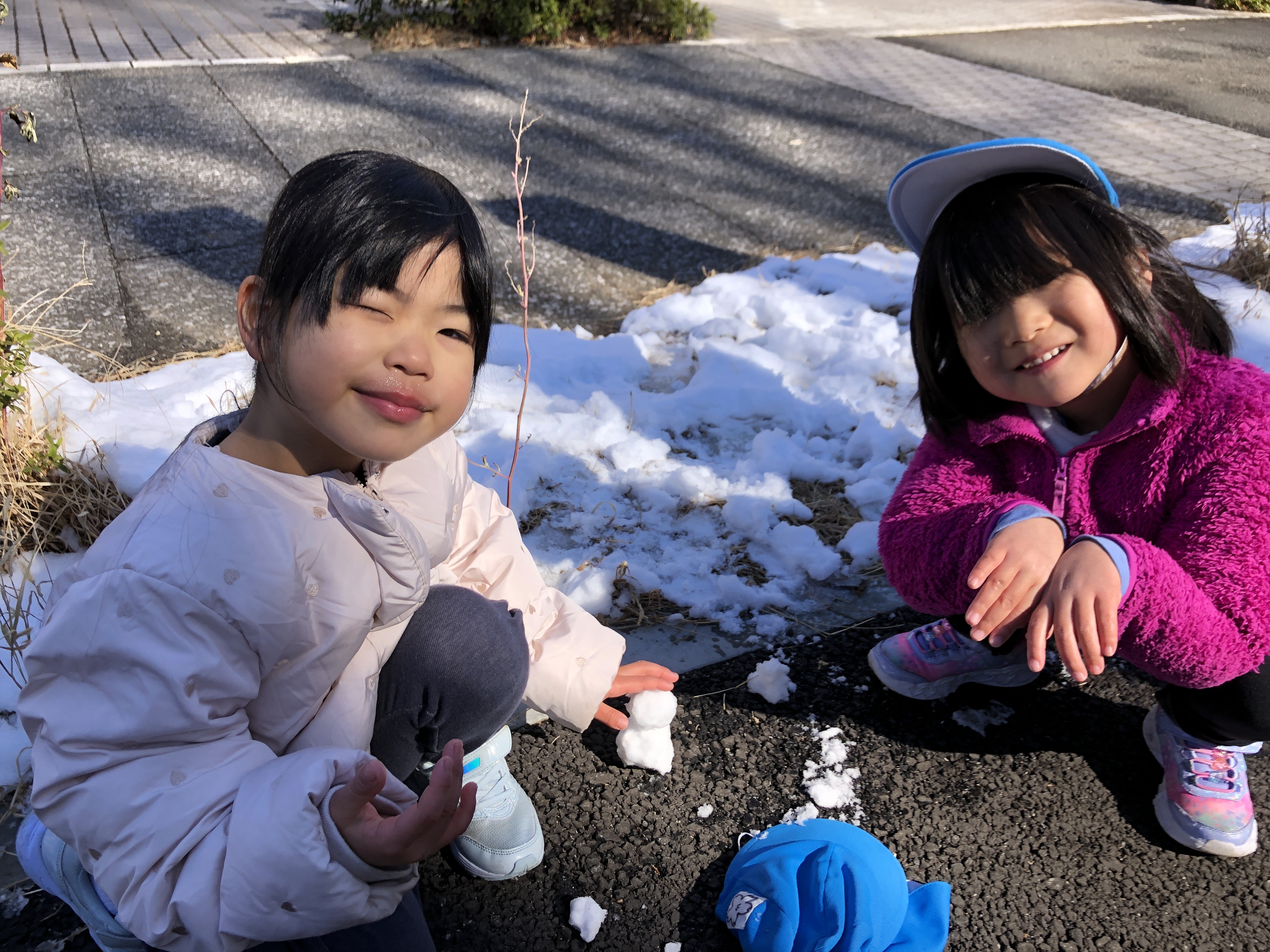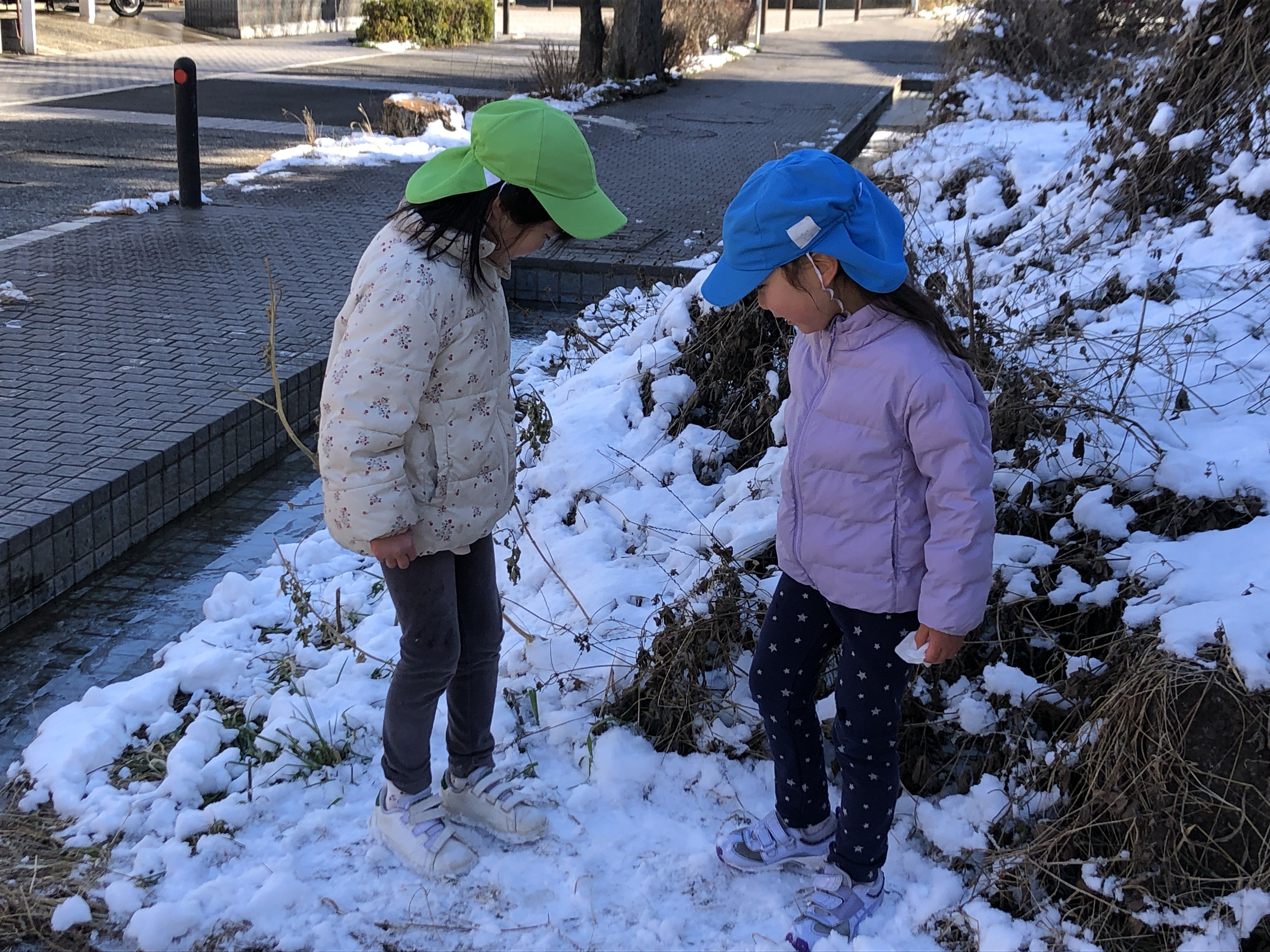幼児クラスは、お散歩に出掛けて雪遊びをしました。いつもの散歩コースも特別に感じました。