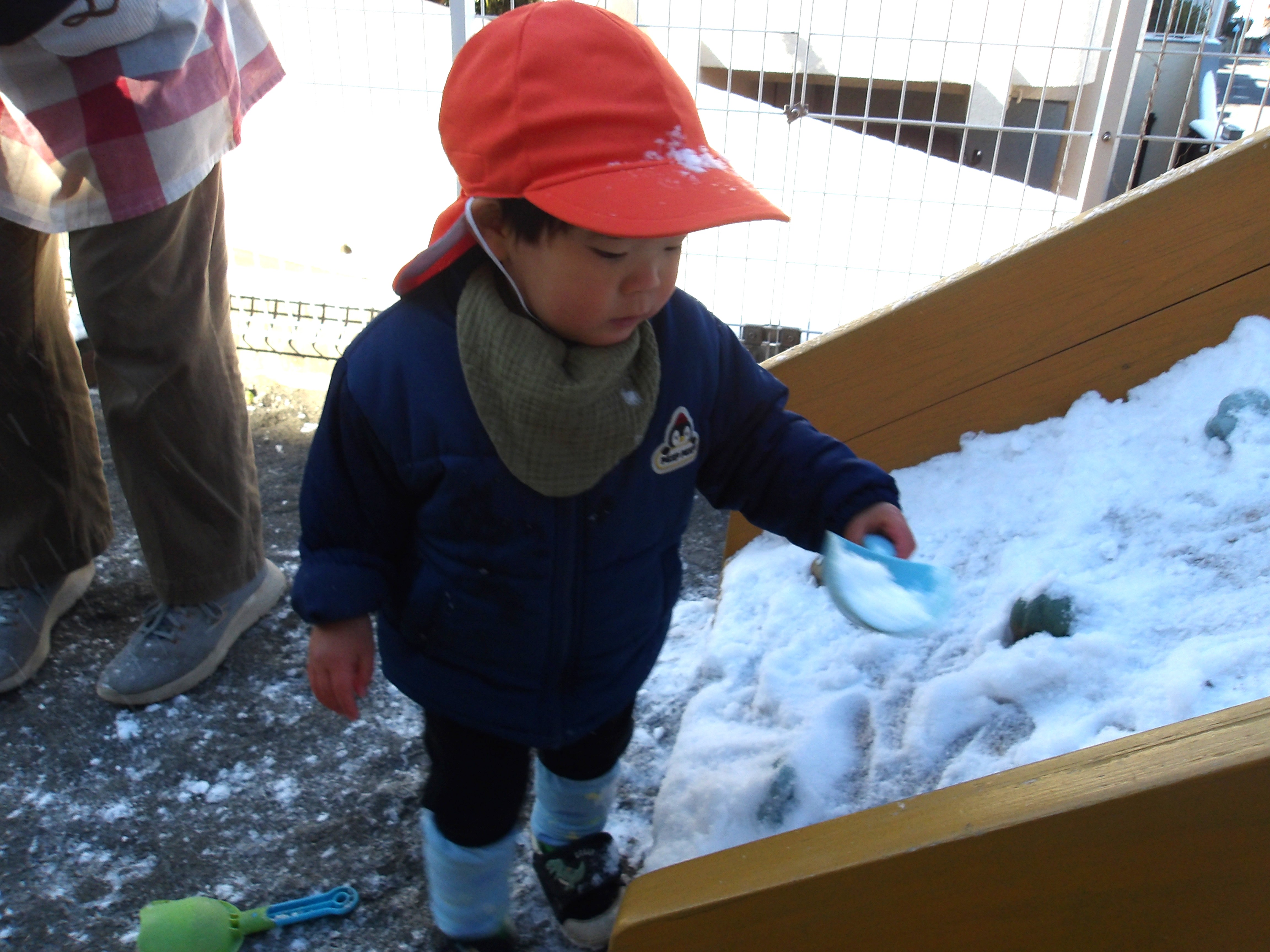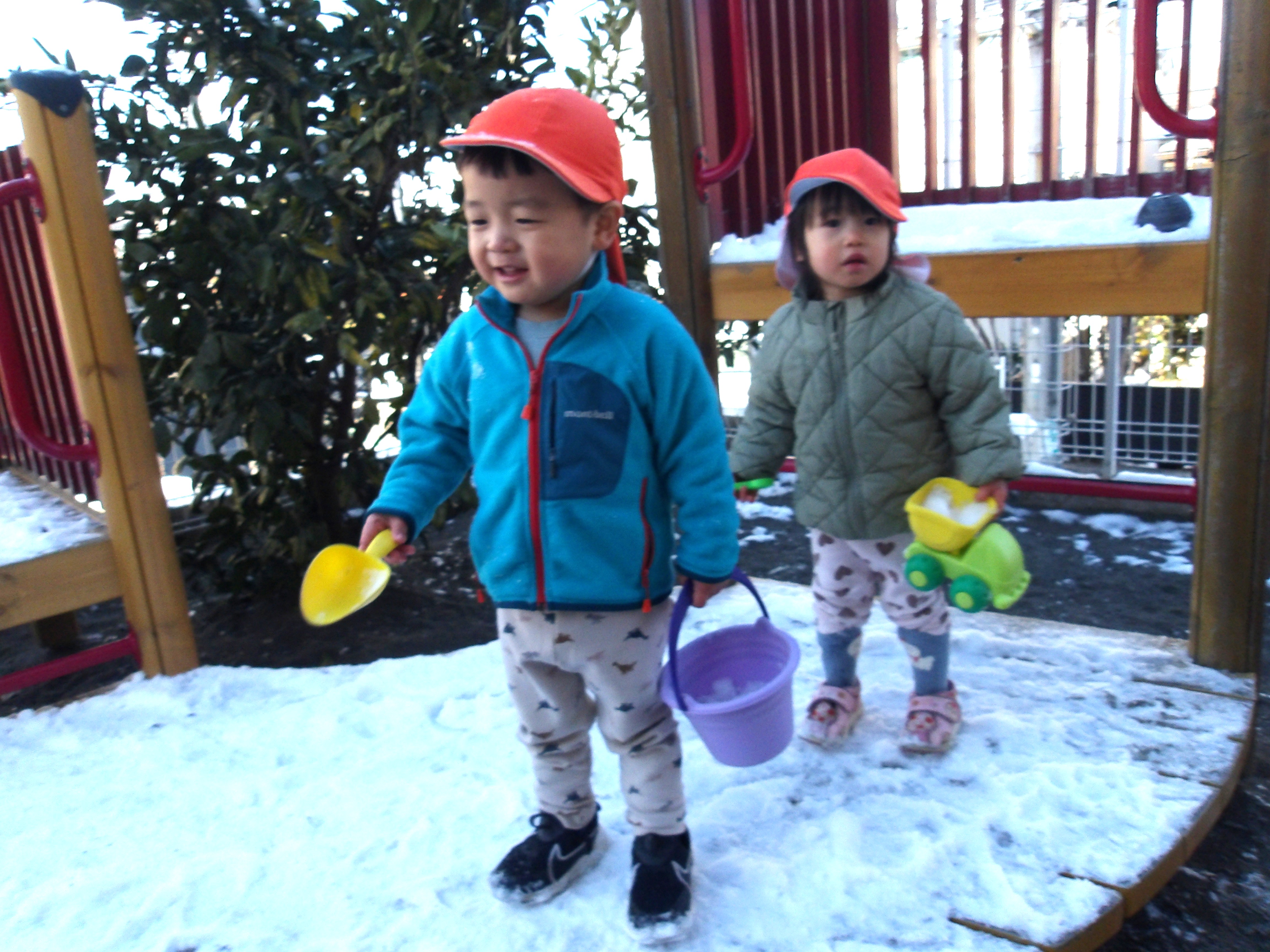 園庭では、シャベルで雪をすくったり、手で触れたりして楽しむ子どもたち。「つめたいよー!」と楽しそうな声をあげ、冬ならではの体験に気持ちが盛り上がっていました。