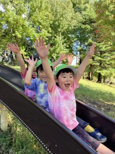 連日の雨で心配だったぬかるみもなく、最高条件で仲良くローラコースターやアスレチックで遊びました。
