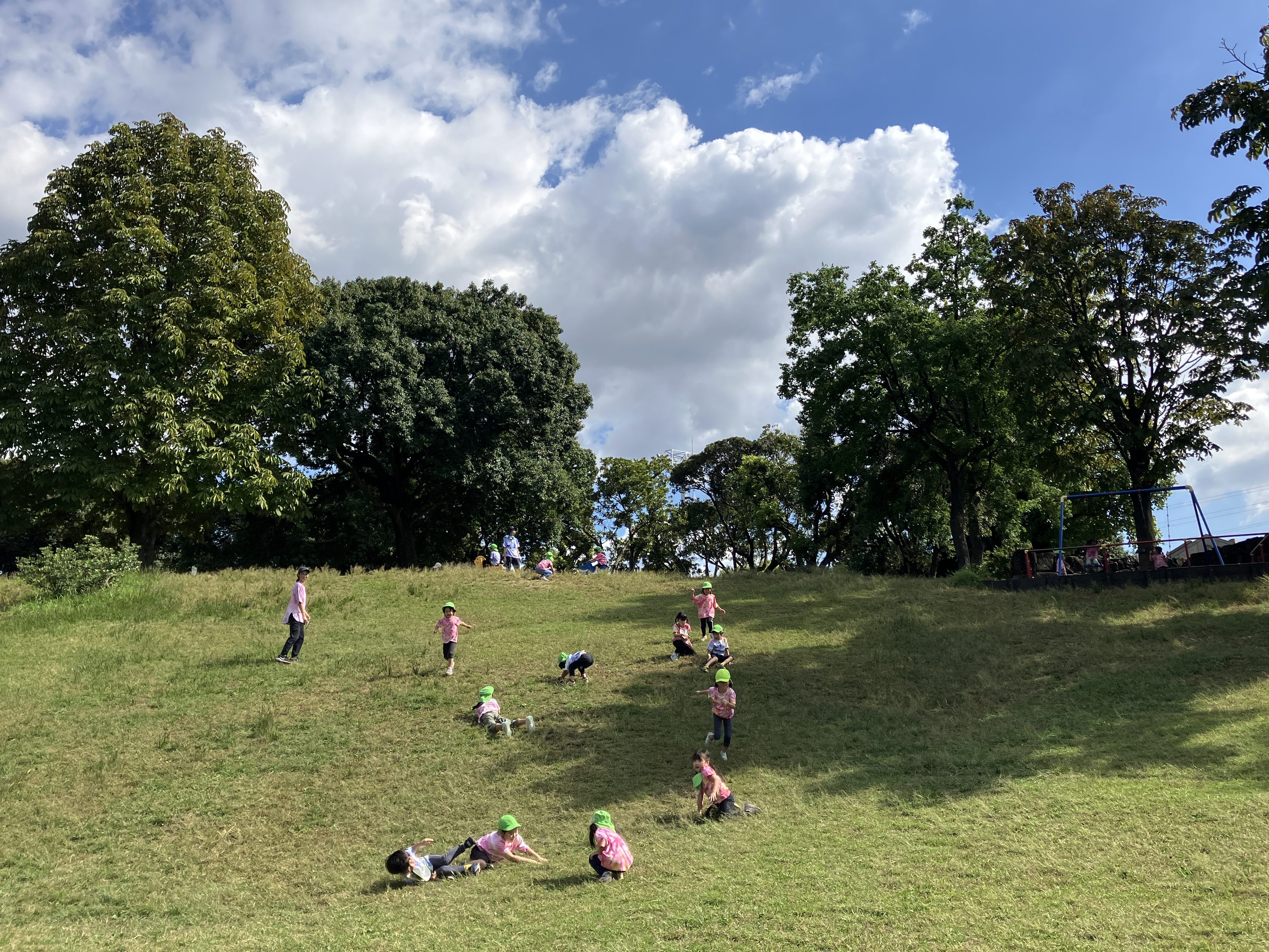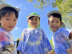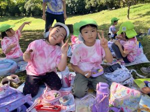 年長そら組の子ども達が、おうちの方の手作りお弁当をリュックに入れて、おそろいの染めたTシャツを着て、岸根公園へクラス遠足に出掛けました。