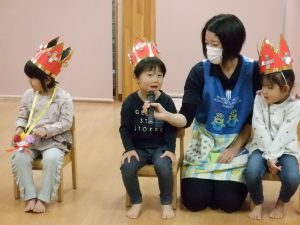 一人ひとりに名前や好きな色、好きな果物等を聞きました。電車やキャラクター等もしっかりと答えてくれました。みんなも温かい拍手を送ってくれていました。