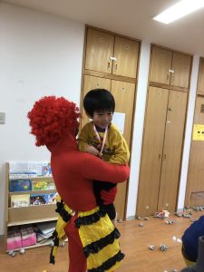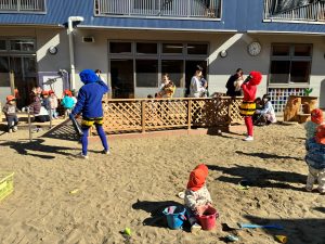 乳児クラスが園庭で遊んでいるところにばったり鬼と遭遇。